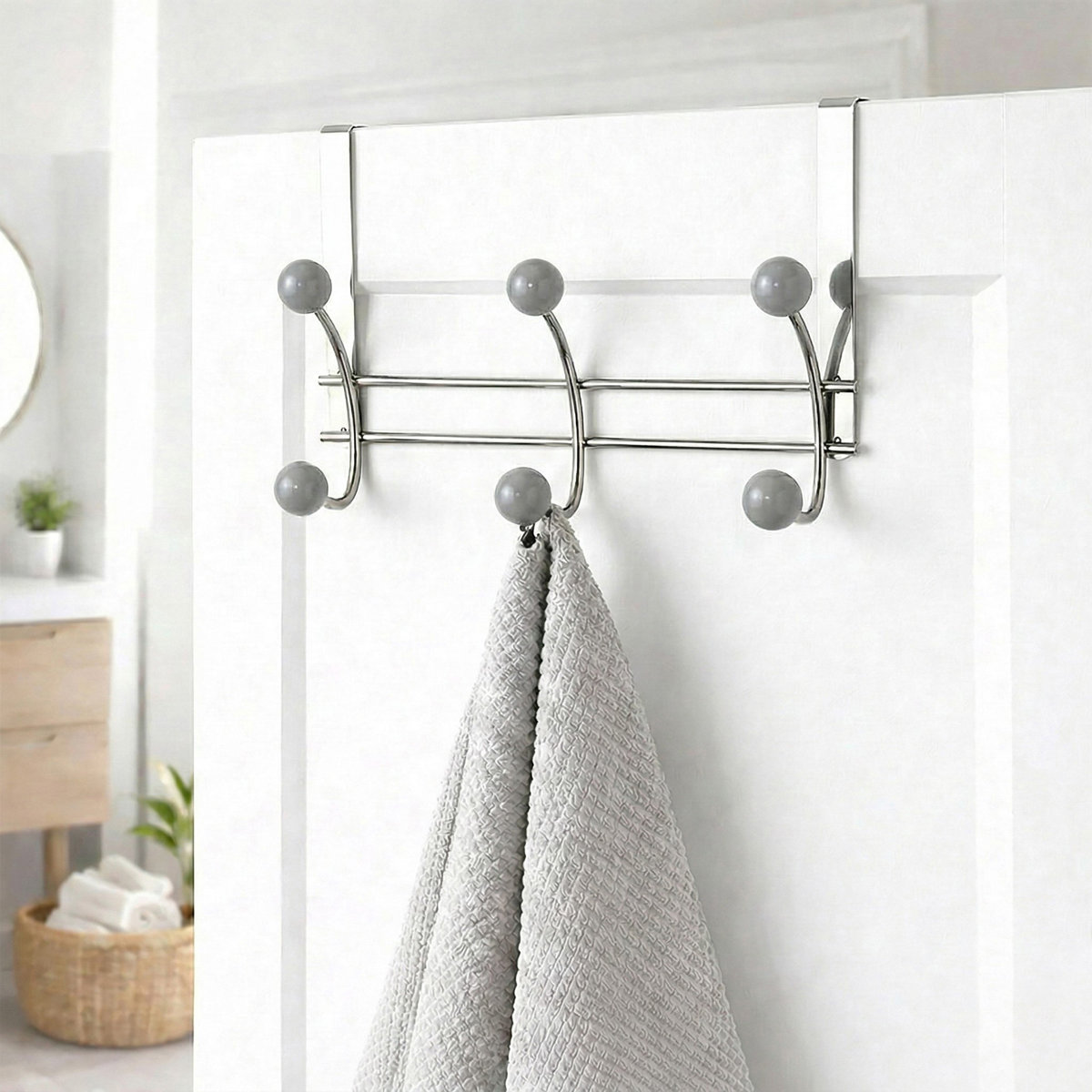 Upgrade your home organization with our versatile over-the-door hooks rack. With three options available, choose between 2, 6, or 8 hooks to perfectly suit your storage needs. Whether it's in your bathroom, bedroom, or closet, this sleek and functional design fits most standard doors, providing convenient storage for coats, towels, bags, and more. Additionally, the stylish combination of chrome and white, gray or natural wood finishes adds a modern touch to any room. Installation is hassle-free. In fact, no tools or drilling are required. Simply hang the rack over your door, and it’s ready to use. Because of this, it’s perfect for renters or anyone looking for a temporary yet stylish storage solution. The durable construction, featuring a sturdy metal frame and ceramic hooks, ensures long-lasting use and can handle even heavy items like coats and bags with ease. Not only does this rack offer practical storage, but it also helps maximize your space. It’s a great option for small apartments or rooms with limited storage options. Furthermore, the variety of colors—white, gray, and natural wood—means you can effortlessly match your décor. Create a clutter-free space while adding a touch of style with this sleek over-the-door hook rack. This product blends functionality and style, making it the perfect addition to your home. Organize your space efficiently while keeping it looking elegant.