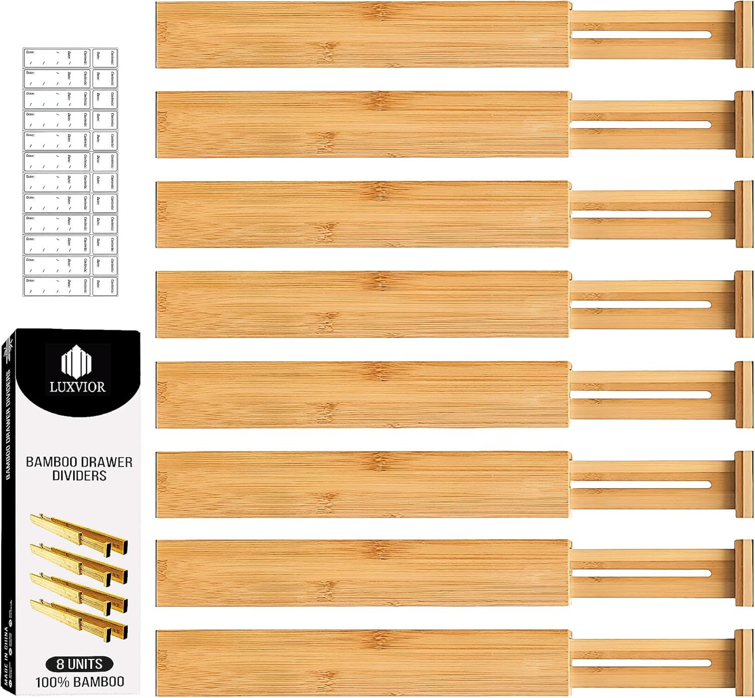 Luxvior Expandable Bamboo Drawer Dividers – 8 Pack with labels | Custom Drawer Organization Upgrade any drawer with Luxvior’s expandable bamboo dividers. Designed for a secure spring-loaded fit, each divider adjusts from 17–22 inches and stands 2.25 inches high, ideal for deep kitchen, bedroom, bathroom, or office drawers. Versatile Organization for Every Space Adjustable & Secure Fit The built-in tension system keeps dividers firmly in place without slipping. Use vertically or horizontally to create a fully customized layout in dressers, cabinets, and vanity drawers. Durable Bamboo Design Crafted from solid bamboo for long-lasting use and a clean, modern look that upgrades any drawer. Organize more with 8 adjustable dividers in every set. Keep any drawer neat and easy to access with LUXVIOR’s expandable bamboo dividers. Made from 100% Moso bamboo, each divider adjusts from 17–22 inches for a secure fit in most drawer sizes. The spring-loaded design ensures quick installation, while built-in EVA pads protect drawers from scratches. For best results, measure your drawer before purchase. Each set includes 8 expandable dividers and 80 labels for organized, customized storage. These bamboo drawer dividers offer flexible organization for items of any size. Crafted from 100% natural bamboo, they are sturdy, durable, and naturally resistant to odors and moisture for easy cleaning. The smooth bamboo finish adds a clean, modern look to any drawer. An ideal housewarming gift for anyone looking to upgrade their home organization. The adjustable design makes it easy to separate clothing, socks, accessories, and everyday essentials for quick access. Built with a strong spring mechanism, these bamboo drawer dividers expand effortlessly to fit a variety of drawer sizes, creating a secure and customizable organization system. Soft EVA foam pads on the top and bottom edges help protect your drawers from scratches while keeping the dividers firmly in place. This non-slip design prevents shifting and helps maintain neat, separated sections for utensils, clothing, office supplies, and more. Bamboo drawer dividers improve organization in any room, from the kitchen and bathroom to the bedroom and office. Designed to separate and neatly arrange everyday items, they make essentials easy to find. Crafted from natural Moso bamboo, these adjustable dividers provide a secure, customizable fit for most drawers. Ideal for organizing cutlery, makeup, clothing, and office supplies while adding a clean, modern look to your space.