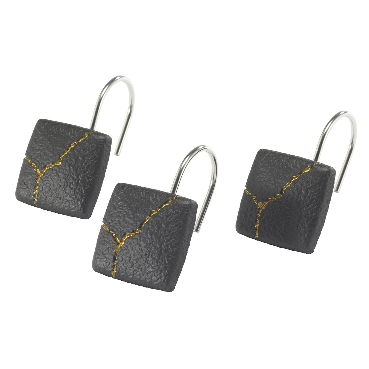 The Nicole Miller Sydney Shower Hooks feature a matte black textured body decorated with gold veins running throughout. Set of 12 hooks made of durable resin for easy care and long life. Coordinating shower curtain, rug, towel and accessories available.