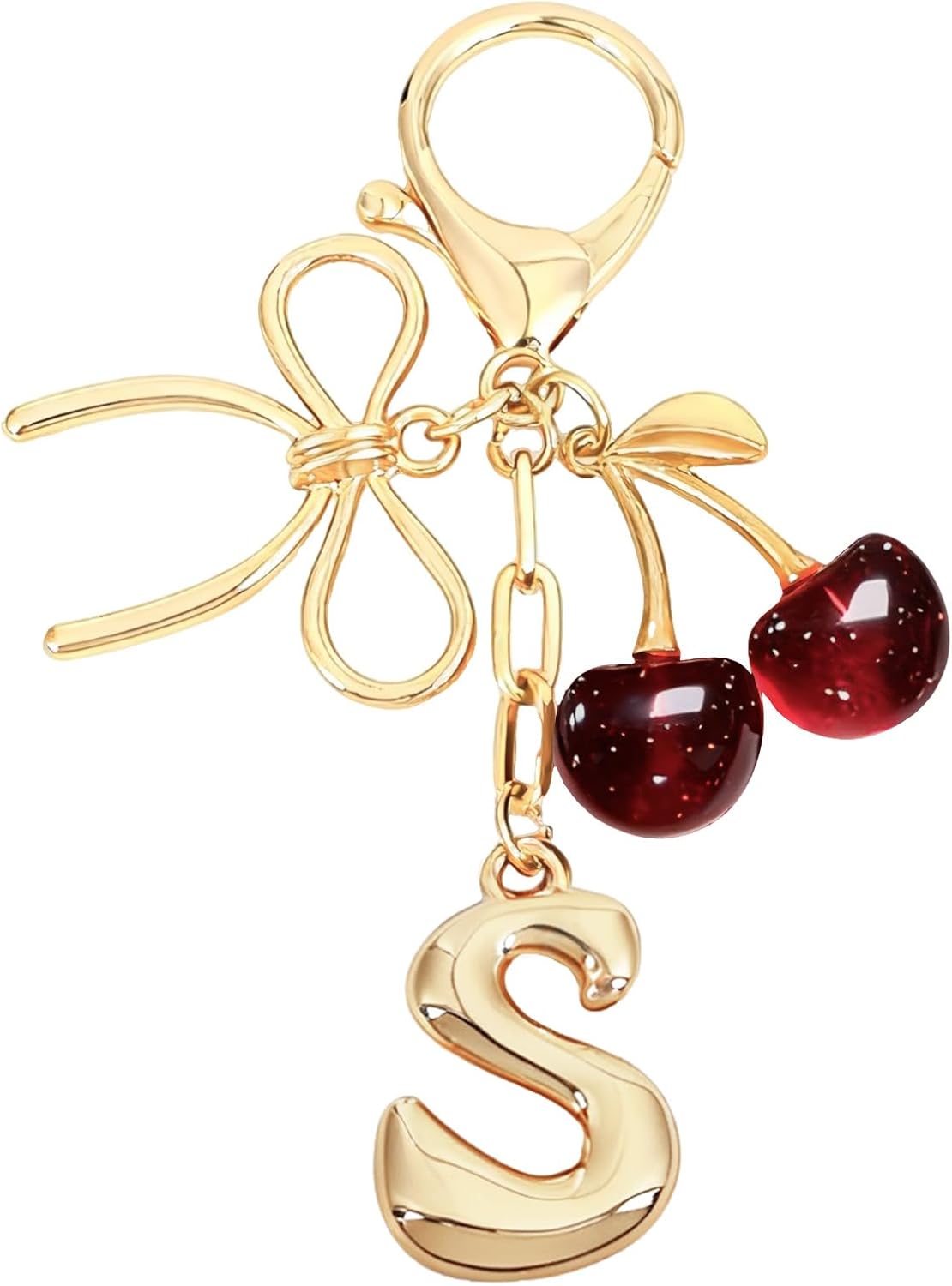Snycler Bubble Initial Keychain with Bow & Cherry - Gold Letter Bag Charms for Women, Cute Purse Handbag Accessories