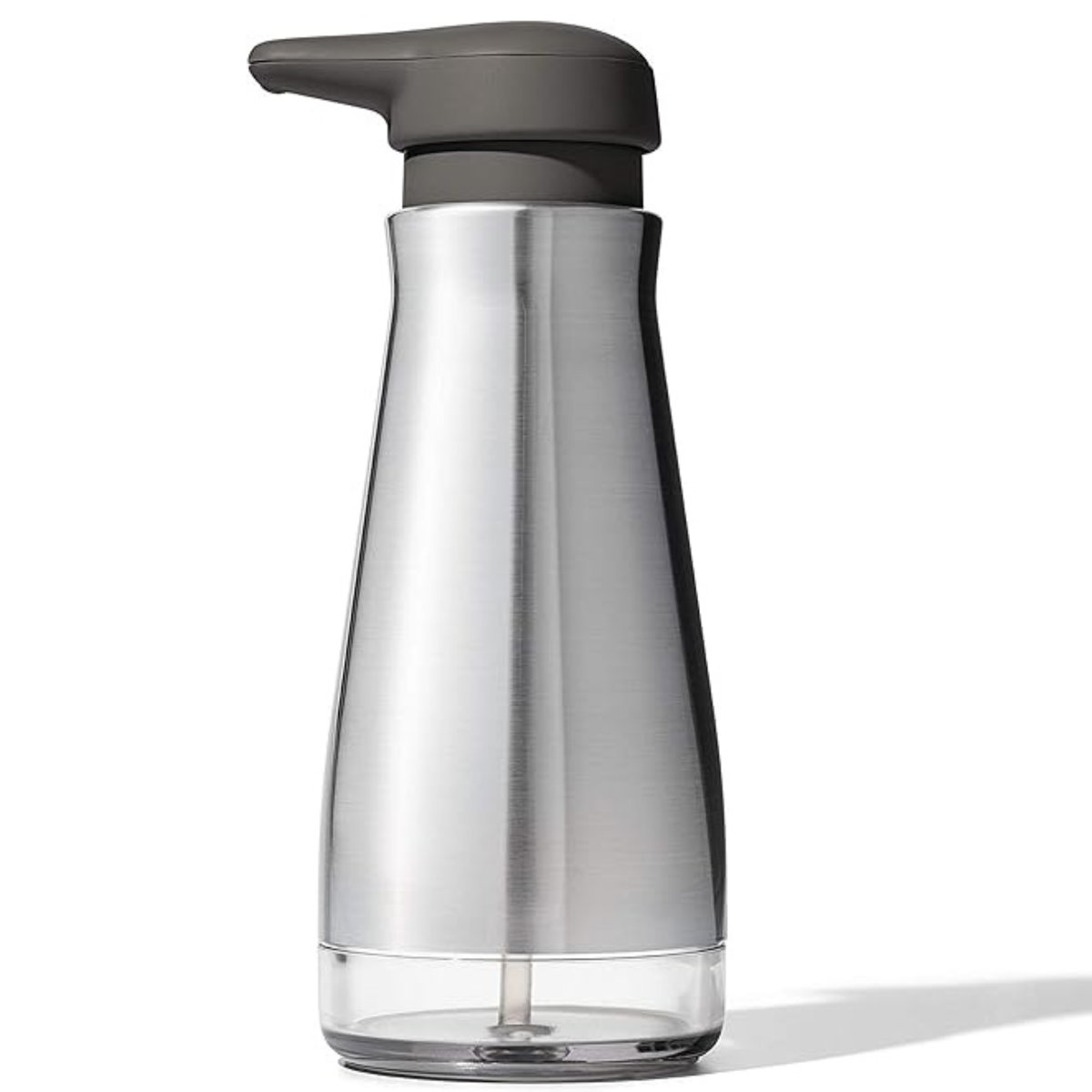 About This Product The OXO Good Grips Stainless Steel Soap Dispenser is designed to make doing dishes less of a chore. Its generous, soft pump and non-slip base ensure stability for reliable, one-handed dispensing. The spout is optimally angled for pumping soap onto a sponge or into your hands or sink. The wide mouth and MAX fill line make it easy to fill—and the clear window shows you when it’s time to replenish. The fingerprint-proof brushed stainless steel construction keeps the Dispenser looking sleek. 12-ounce capacity. Features Clear window lets you view contents Designed for easy one-handed dispensing Wide-mouth body for easy refills Comfortable button cushions palms while you press Spout is ideal for dispensing onto sponge or directly into sink 15-ounce capacity with wide opening for easy filling Fingerprint-proof coating keeps Dispenser neat Non-slip base and button for stable, hassle-free use Clear window shows when it's time to refill Simply unscrew the top to add or refill contents Non-slip base keeps Dispenser in place.Intended for use with liquid soap or lotion do not use with foaming soap.12-ounce/355-ml capacity.Not recommended for use with hand sanitizers Also suitable for dispensing lotion. Not recommended for use with hand sanitizers Clear window shows when it's time to refill; MAX fill line helps prevent overfilling