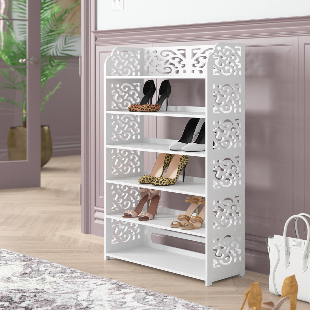 Add a glam storage solution to your entryway or closet with this 38'' shoe rack. Made from white plastic and acrylic, this shoe storage solution features scrolling cut-out designs for an airy, luxe appearance. With six shelves, it can accommodate up to 18 pairs of shoes, ensuring your collection stays organized and easily accessible. We love that its open-shelf design allows for quick and easy access to your favorite footwear while keeping your space clutter-free. Plus, there's room up top for a key tray or decorative photos.