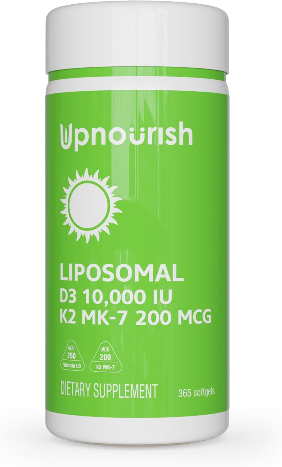 - Vitamin D3 K2 10000IU and 200 mcg: D3 and K2 are essential vitamins for the body. One UpNourish Liposomal D3 K2 softgel is packed with 10000IU vitamin D3 cholecalciferol and 200mcg vitamin K2 as MK-7.