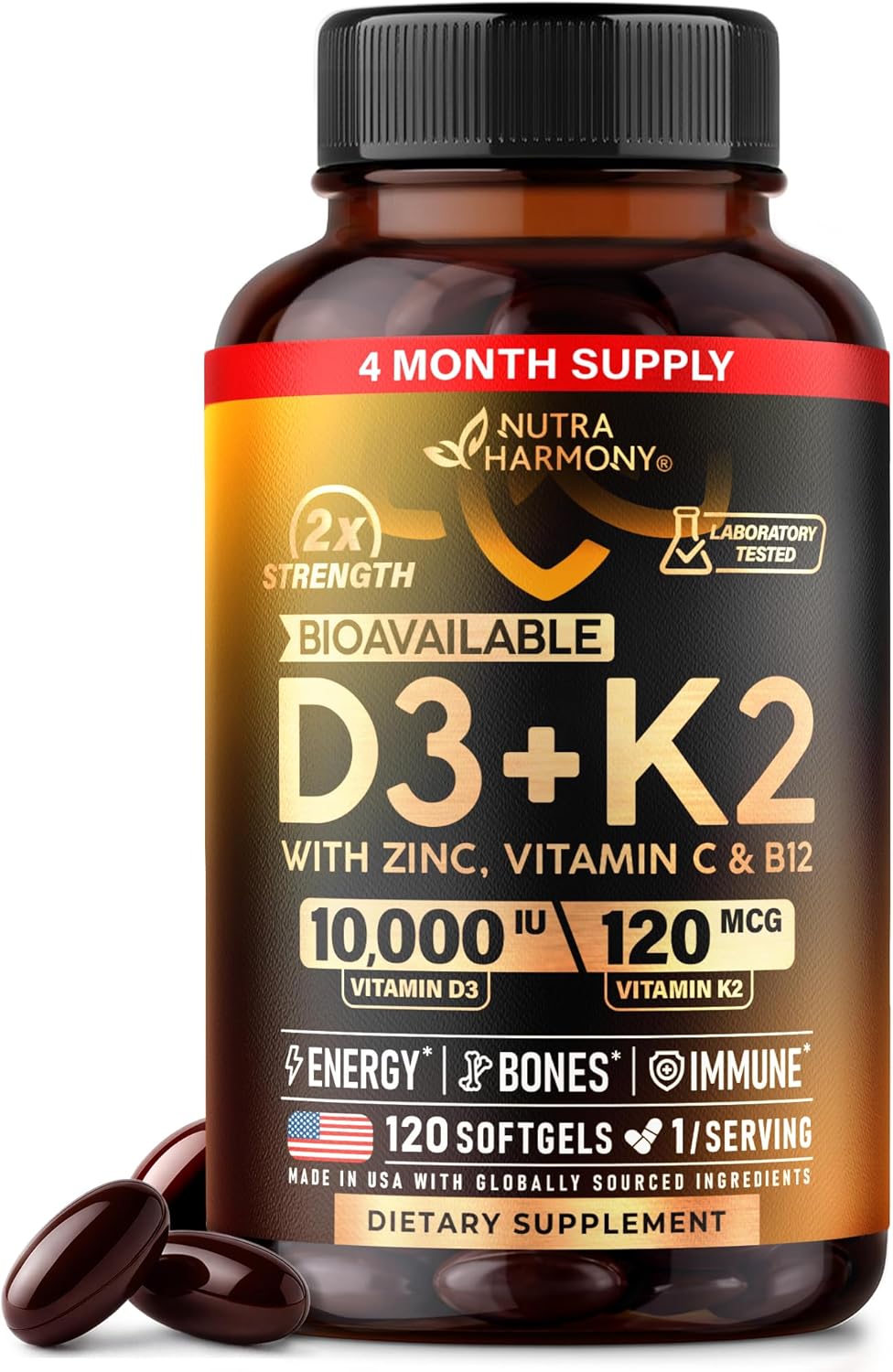 - HIGH-POTENCY VITAMIN D3+K2 FORMULA – each softgel delivers an extra-potency dose of Vitamin D3 (Cholecalciferol) combined with Vitamin K2 in two forms: (MK-7 and MK-4). These essential fat-soluble vitamins are carefully paired to work synergistically, supporting optimal absorption, bioavailability, and overall effectiveness.