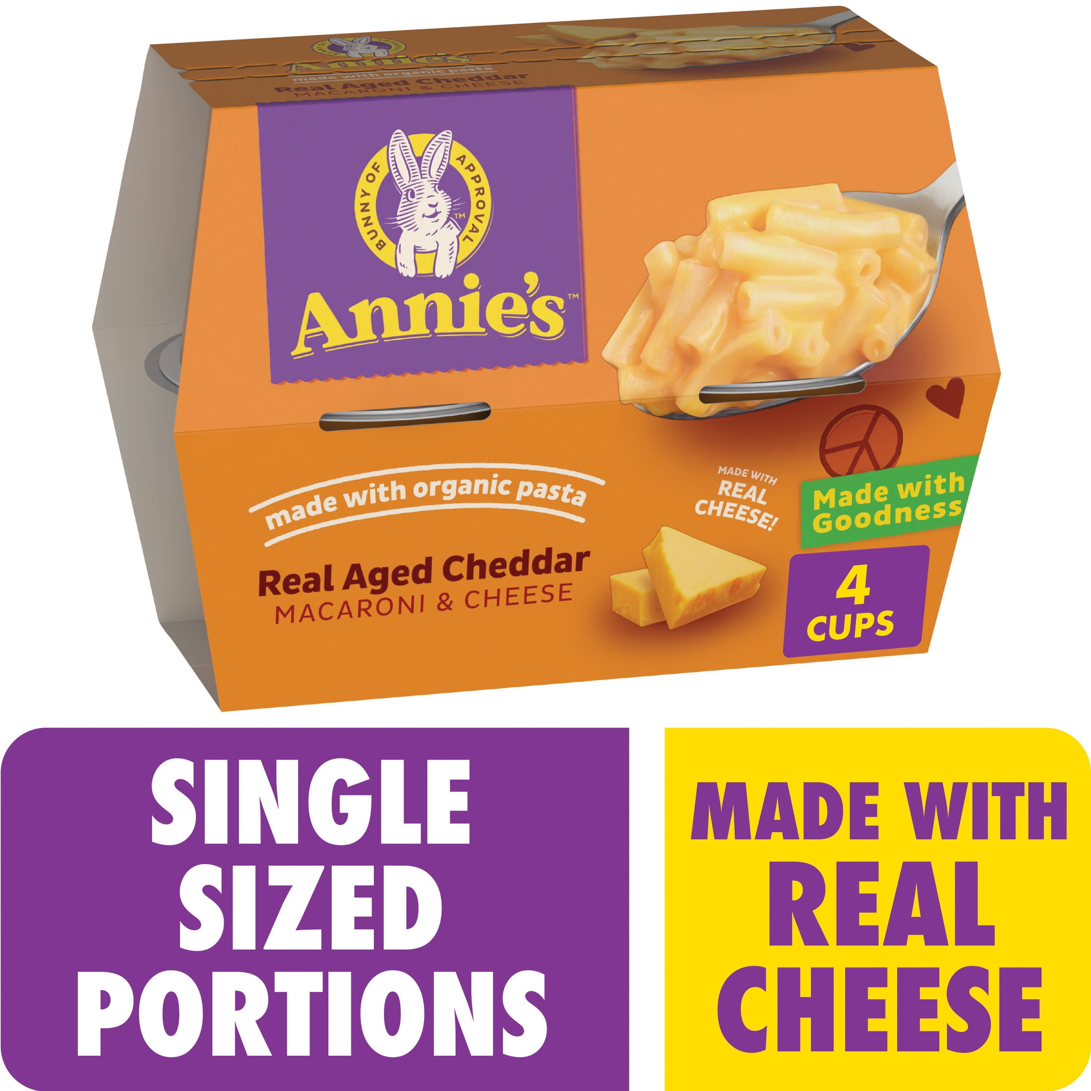 Annie's Real Aged Cheddar Mac and Cheese Cups make dinner sides and kids snack time easy and delicious. Each Annie's mac and cheese cup is made with organic pasta and flavorful real aged cheddar cheese with a creamy, dreamy taste that is impossible to resist. Annie's microwavable mac and cheese is made with real cheese from cows not treated with rBST*, offering quality ingredients in every cup. Without artificial flavors or synthetic colors, you can feel good about serving and enjoying a tasty and wholesome cup of Annie's mac and cheese. Annie's macaroni and cheese cups are perfect for lunch, dinner, or any time you're in the mood for something downright delicious. These microwave mac and cheese cups are ready in minutes, making them a great-tasting adult and kids food option for busy bunnies and families on the go. Simply remove the cup lid and cheese packet, add cold water to the fill line, and stir. Microwave on high for two minutes, mix in the cheese packet and enjoy as a snack or paired with a kid-friendly protein like chicken nuggets. This convenient adult and kids mac and cheese pack comes with four cups you can easily store in a pantry or take along to microwave while on the go. Annie's makes products in over 20 family-friendly categories, from fruit-flavored snacks and cereal to mac and cheese. For busy bunnies and families on the go, we help make life a little easier and more delicious by spreading goodness through tasty foods and kindness to the planet. *No significant difference has been shown between milk derived from rBST-treated and non rBST-treated cows.