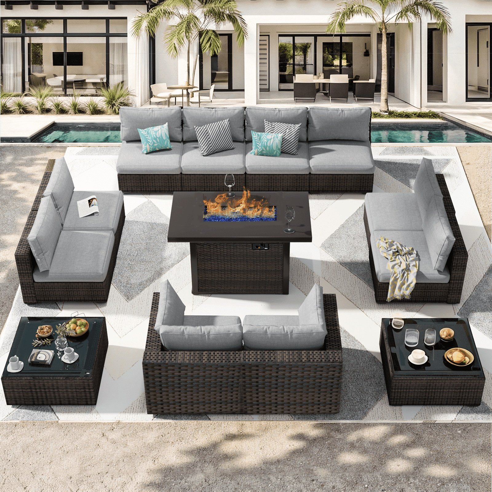 Grezone 13 Piece Patio Furniture Set with Fire Pit Table, All Weather Outdoor Sectional PE Rattan, Patio Conversation Sets with Cushions and Glass Coffee Table for Garden Lawn Balcony