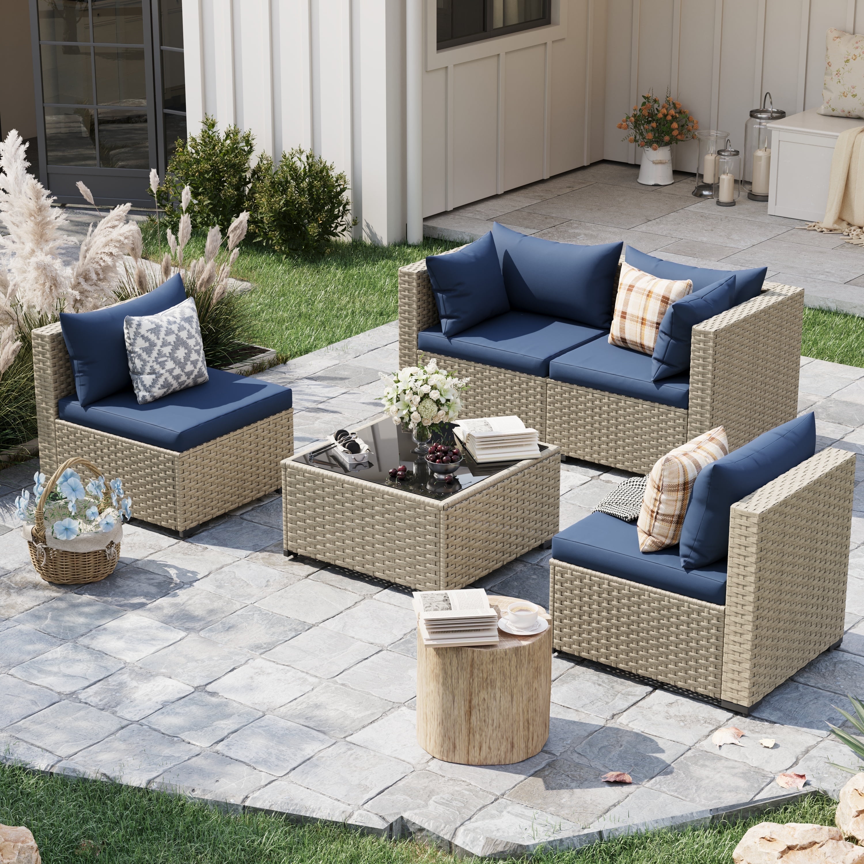 POTEBAN 5 Pieces Outdoor Patio Furniture Set, Outdoor Wicker Patio Conversation Set with Cushions for Backyard, Porch, Garden(Navy Blue)